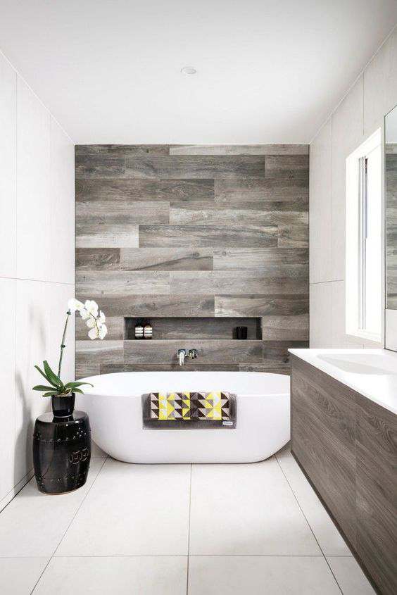 - lemnul (îmbunătățit) – deși în stare naturală cauzează numai probleme la contactul cu apa, lemnul îmbunătățit (cel mai popular este cel de salcâm) este rezistent la apă și plăcut la atingere. Dacă bugetul cerut de acest material îl depășește pe cel destinat amenajării băii tale, poți oricând opta pentru gresie cu imitație de lemn (cu un look similar și neaderent).