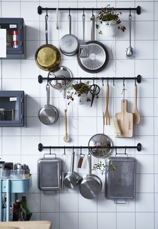 În bucătărie, sub dulapurile superioare, poţi monta bare cu cârlige pentru a prinde prosoape, ustensile, uscător de vase, ba chiar şi ceşti sau căni. Poţi amplasa pe contrablat un suport magnetic de care să prinzi borcane de condimente cu capac metalic, ba chiar şi tigăi ușoare.