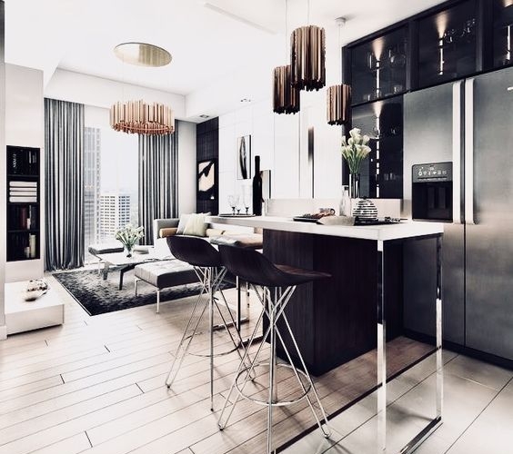 În privința parchetului, îți recomandăm nuanțele de alb sau gri, sugestie pe care o menținem și în privinț\ electrocasnicelor, din inox sau email.