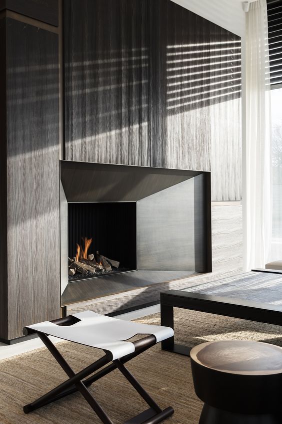 Designul elegant al șemineului din oțel inoxidabil poate adăuga rafinament camerei. Are un aspect ultra-modern, în comparație cu vatra tradițională. Culoarea se potrivește perfect în schema de culori neutre a unei camere amenajate în stil scandinav, în timp ce strălucirea metalică oferă un punct focal vizual în spațiu. Lipsa unei încadrări tradiționale sau a oricărui decor suplimentar sporește aspectul simplist. Șemineul, care ocupă propriul perete, creează o prezență monolitică în cameră, accentuând importanța căldurii în acest moment al anului.