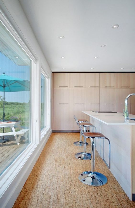 Pluta este o idee bună pentru podeaua din bucătărie, pentru că are o textură unică și oferă o senzație moale, plăcută sub tălpi. Este un material izolator natural, atât termic, cât și fonic. Prin definiție, pluta este antimicrobiană datorită unei substanțe ceroase din compoziția sa, care respinge insectele și dăunătorii. Nu în ultimul rând, varianta plutei ca pardoseală este una low-cost, plăcile din plută fiind ușor de montat de unul singur.