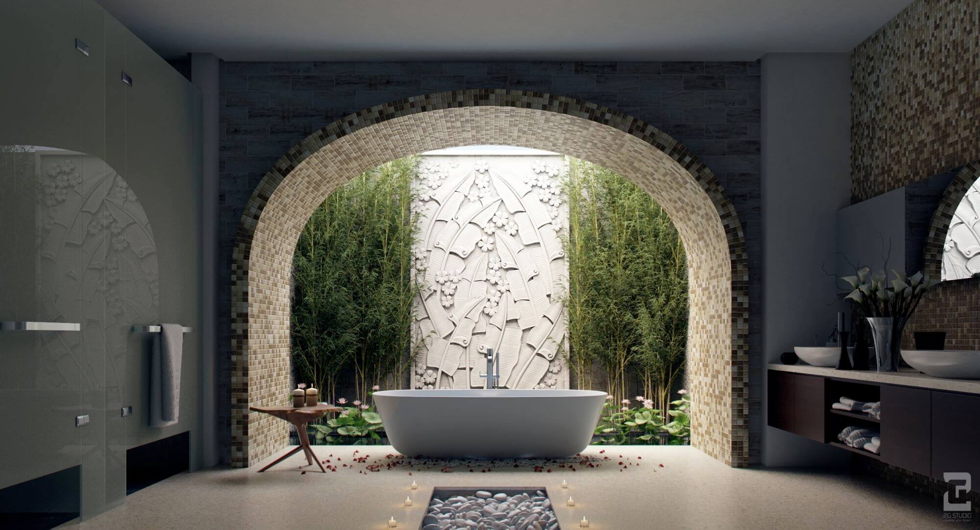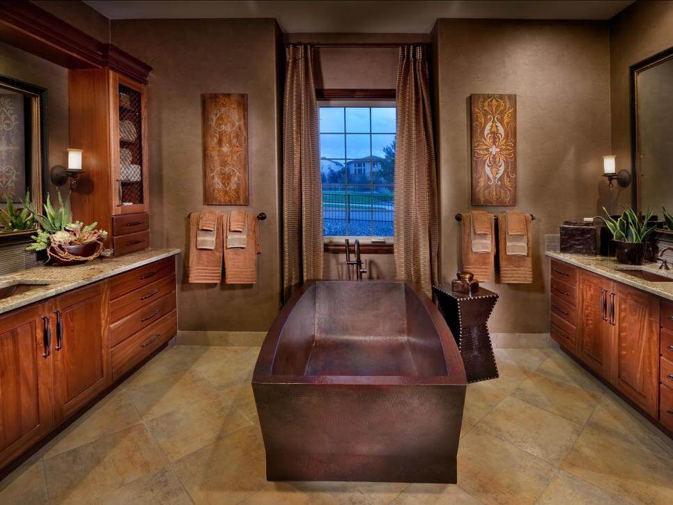 Modelul din imagine, creat de Dahlia Mahmood, are o bază de lemn și marmură care oglindește tavanul circular și se încadrează perfect într-o baie deosebit de spațioasă.