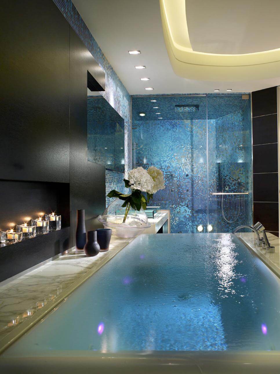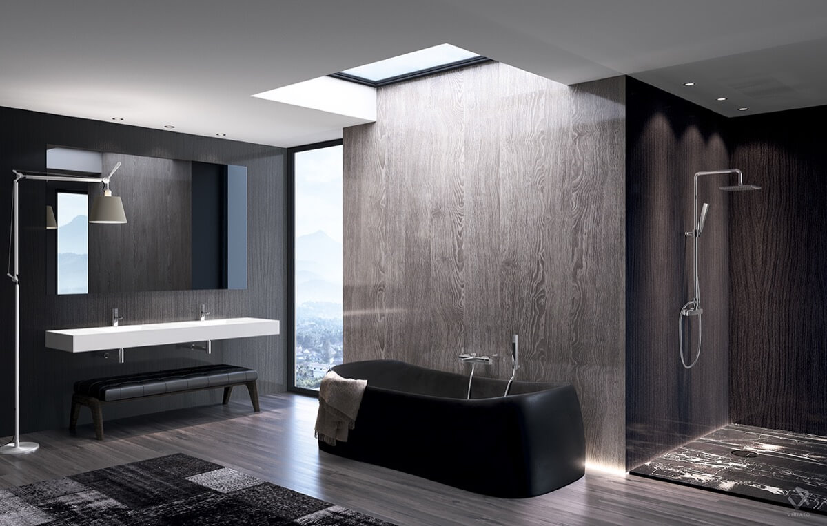 De asemenea, cada insulară poate crea un efect cu totul neașteptat, printr-un design diferit, amplasare neconvențională și texturi contrastante, cum ar fi marmura neagră strălucitoare a căzii din imagine și placa albă protectoare, dispusă pe un parchet din lemn.