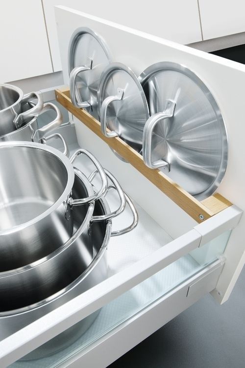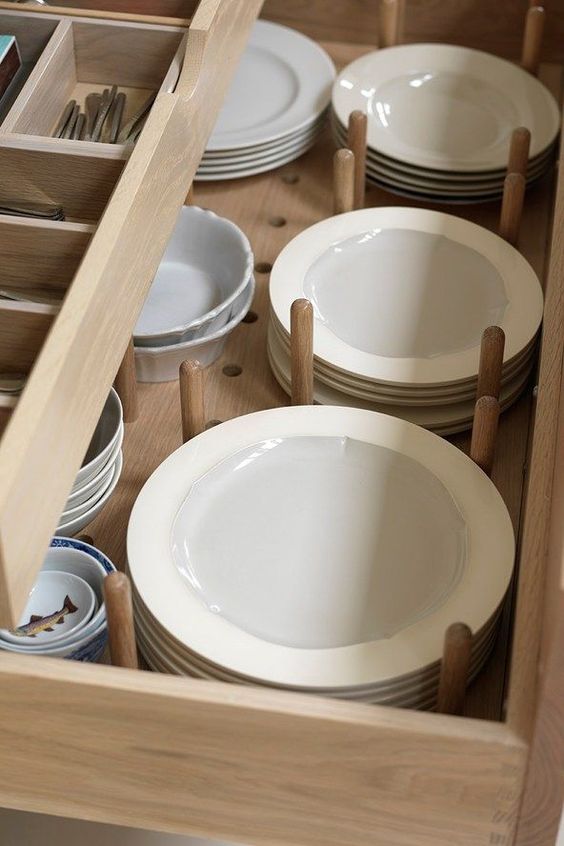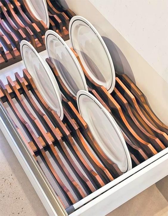 Despărţitoarele pot organiza şi vesela. Un suport de lemn ar putea face diferenţa ca spaţiu şi ca manevrare. Acest suport de lemn poate consta în câteva coloane aşezate vertical, servind ca suport pentru farfurii. În ceea ce priveşte bolurile, este indicat să le pui unele într-altele, dacă greutatea lor îţi permite. Când vrei să depozitezi oale în sertare, poţi improviza şi un loc pentru capacele lor, improvizând un raft direct în sertar, după modelul pe care ţi-l vom prezenta în galeria foto.