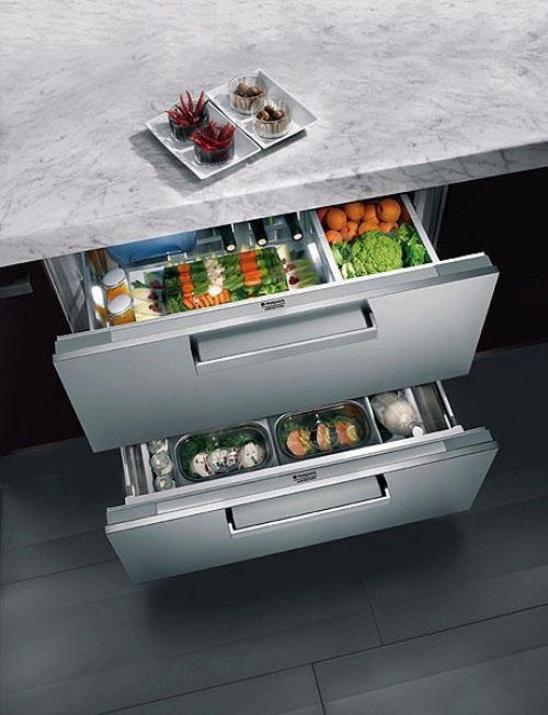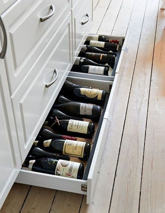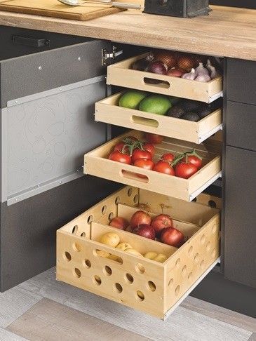 Sertarele pot găzdui conservele sau borcanele în locul unei cămări: ceapă, cartofi sau fructe aşezate în lădiţe sau coşuri. În cutii transparente cu eticheta, poţi aşeza în sertar şi alte tipuri de alimente de bază: orez, faină, mălai, paste etc. Chiar şi condimentele pot beneficia de propriul lor sertar, organizat similar unei table de Remi, pe 2 rânduri, exemplu pe care îl vei regăsi tot în galeria noastră foto.