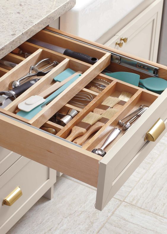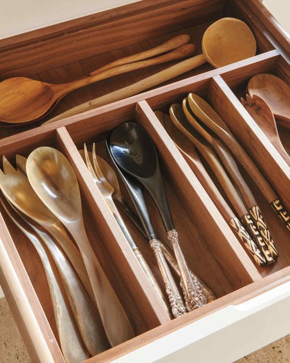 În funcţie de obiectele depozitate în sertare, organizatoarele pot varia: tacâmurile se ţin cel mai bine pe orizontală, cu ajutorul despărțitoarelor. Acestea pot fi simple paravane în cruce sau chiar cutii diferite. Dacă ai decis să le pui într-un sertar înalt sau în dulap, poţi înlocui despărţitoarele cu borcane.