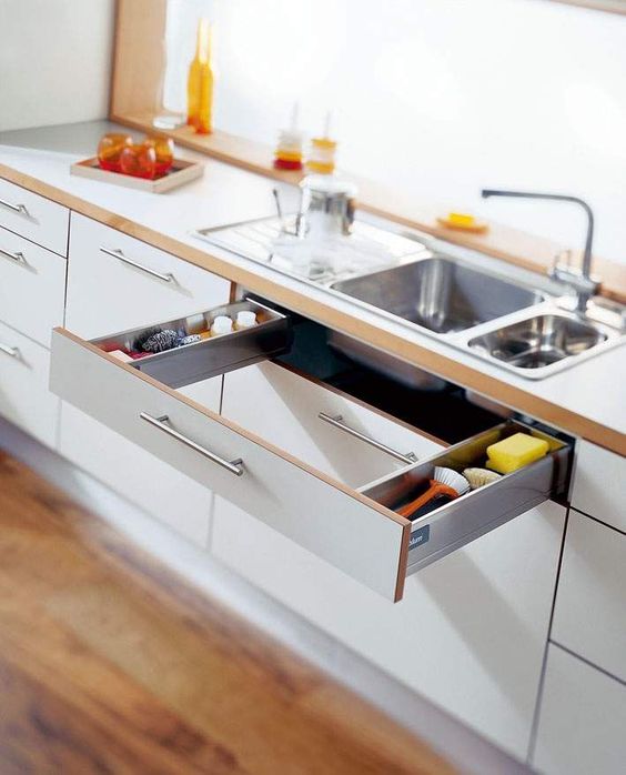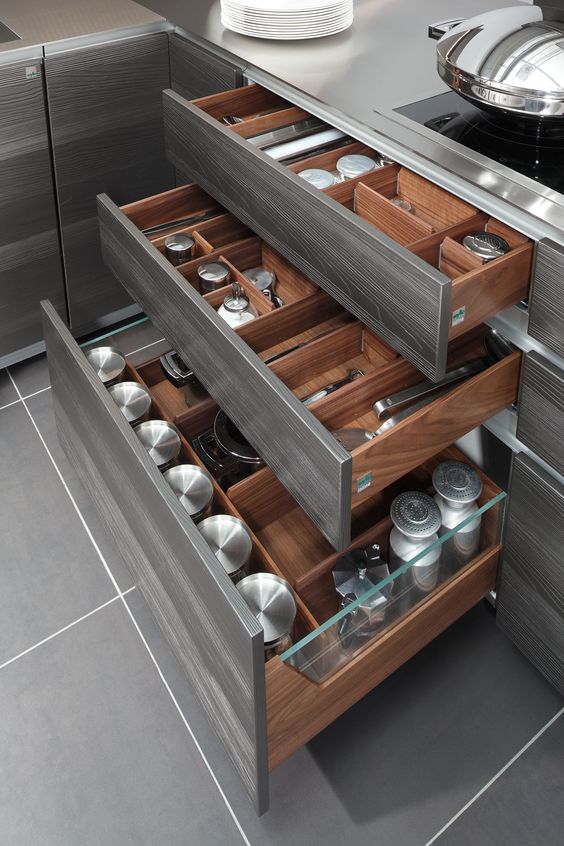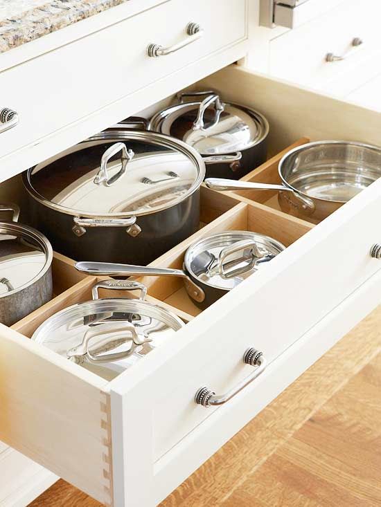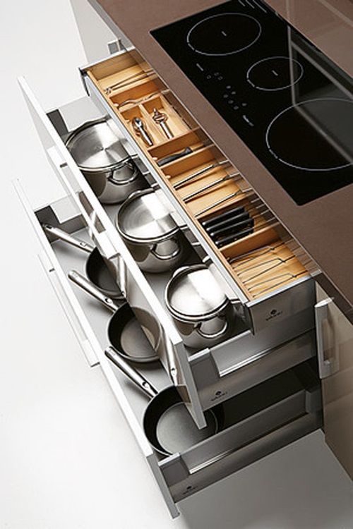 Chiar dacă sertarele sunt un loc propice organizării, nu toate obiectele şi alimentele din bucătărie trebuie să ajungă acolo. Dacă mărimea sertarelor nu permite depozitarea oalelor, așază-le una într-alta sau alăturate într-un dulap cu ușă. Dacă ai o cămară încăpătoare, prioritizeaz-o pentru conserve şi borcane cu bunătăți şi lasă sertarele pentru ustensile şi accesorii. Scopul organizării este să găsești mai repede ceea ce cauţi, aşa că aranjează-ţi bucătăria astfel încât ţie să-ţi fie cât mai uşor. Iată un articol cu mai multe trucuri de depozitare.